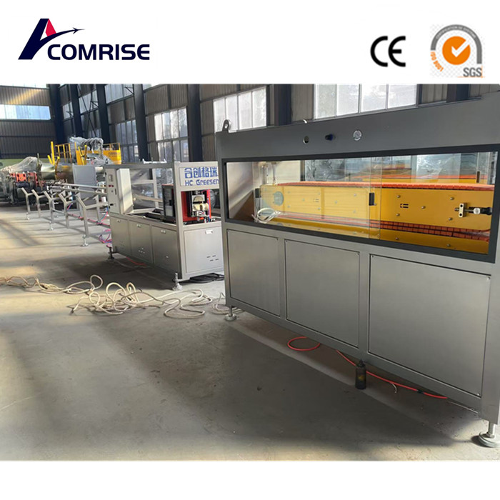 सिंगल स्क्रू एक्सट्रूडर → कलर स्ट्रिंग और मल्टी-लेयर सीओ एक्सट्रूडर → मोल्ड → वैक्यूम कैलिब्रेशन टैंक → स्प्रे कूलिंग वाटर टैंक → हॉलिंग → कोई डस्ट रिमूवर → स्टैकर → अंतिम उत्पाद निरीक्षण और पैकेजिंग