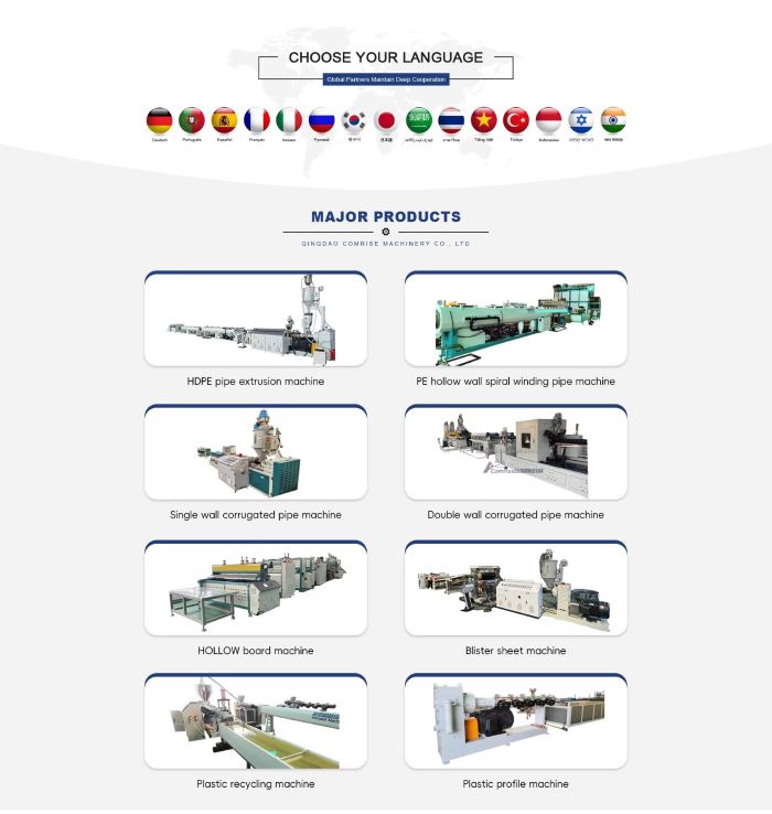 हमारे पास कई उत्पाद हैं जैसे कि पीई पाइप उत्पादन लाइन, पीवीसी पाइप उत्पादन लाइन, प्रोफ़ाइल उत्पादन लाइन, ग्रैन्यूलेशन उत्पादन लाइन, शीट उत्पादन लाइन, आदि। आप विभिन्न उत्पादों से चुन सकते हैं।